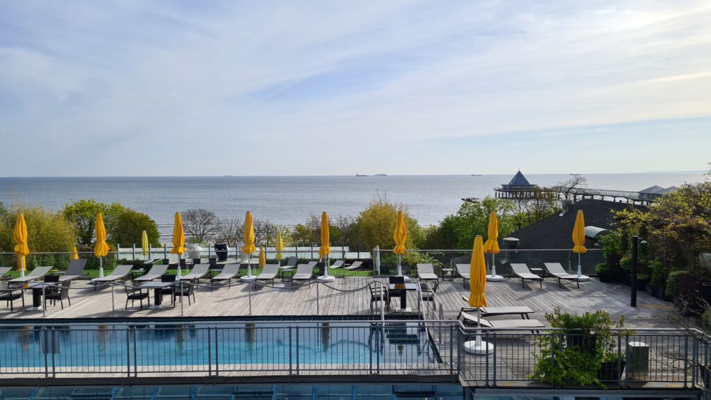 Ein letzter wehmütiger Blick aus dem Fenster und auf die Schiffe die uns jeden Tag erfreut haben und ein letztes Frühstück bevor es mit dem PKW Fahrstuhl wieder an die Erdoberfläche geht.